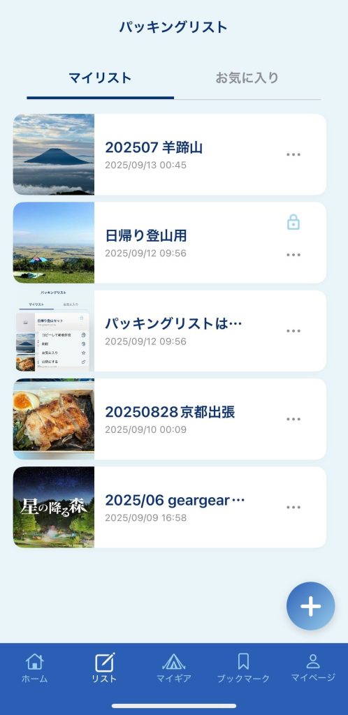 アプリのメニューから「パッキングリスト」を選び、右下の 「+」ボタン をタップ。